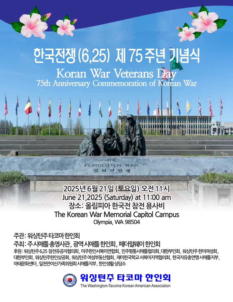 워싱턴-타코마한인회(회장 김창범ㆍ이사장 김옥순)는 이번 주말인 21일 오전 10시30분 올림피아 워싱턴주청사 한국전 참전비에서 제75주년 6ㆍ25전쟁 워싱턴주 기념식을 개최한다.