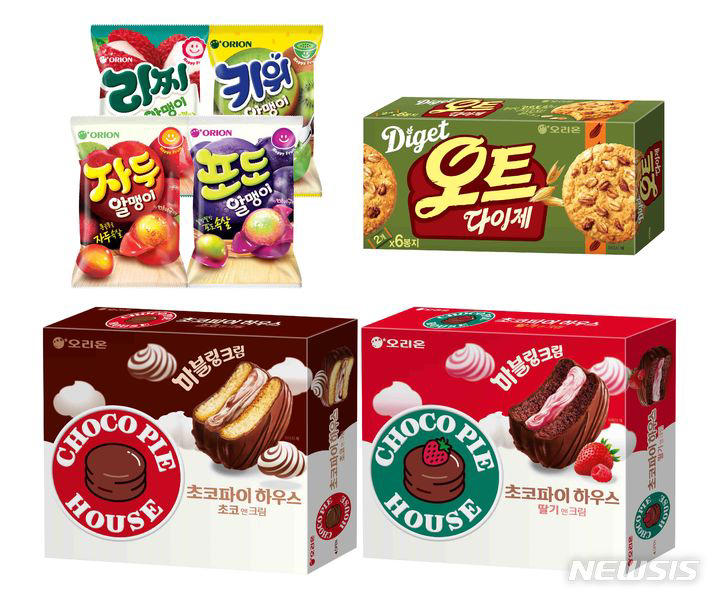 [서울=뉴시스] 오리온 '초코파이하우스∙마이구미 알맹이∙오트 다이제'. (사진=오리온 제공) © 뉴시스
