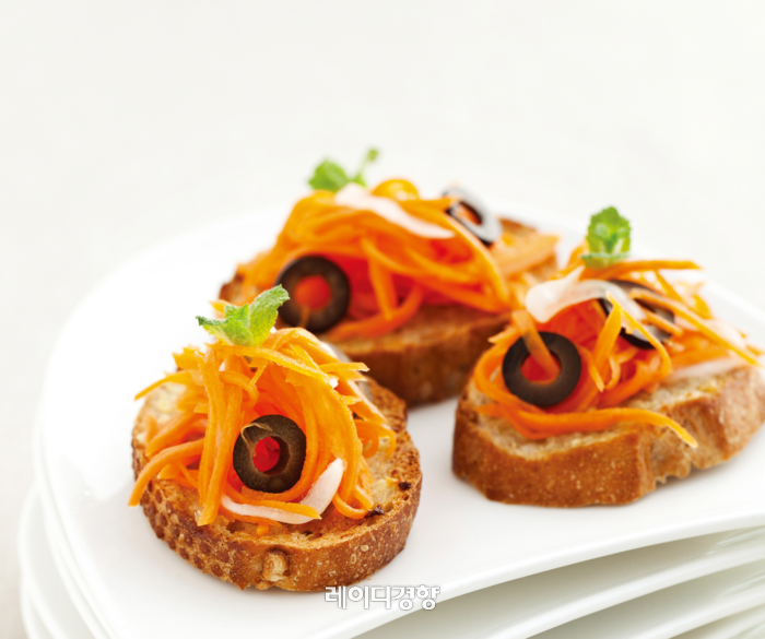 바게트 빵에 마늘소스 발라 구운 뒤, 미리 만들어둔 당근라페를 슥 얹으면 끝입니다. © 경향신문