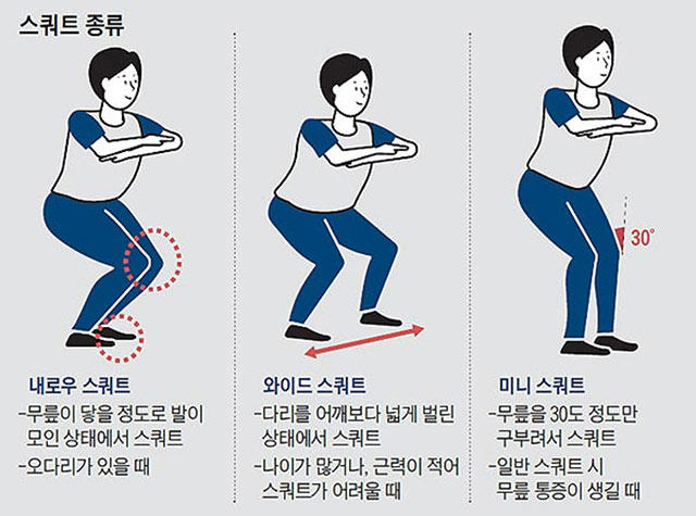 무릎을 크게 굽혔다 펼 때마다 통증이 느껴진다면 무릎 사이 연골판이 약해진 상태일 가능성이 크다. 이때 무리해서 일반 스쿼트를 하면 통증이 더욱 심해질 수 있다. 따라서 무릎을 30도 정도로 조금만 굽히는 '미니 스쿼트'를 하는 게 좋다. 그럼 연골판에 가해지는 부담을 줄이면서 하체 근육을 충분히 자극할 수 있다. 만약 운동 효과가 없다고 생각되면 다리 각도가 아닌 한 세트에 반복하는 횟수를 조절한다.