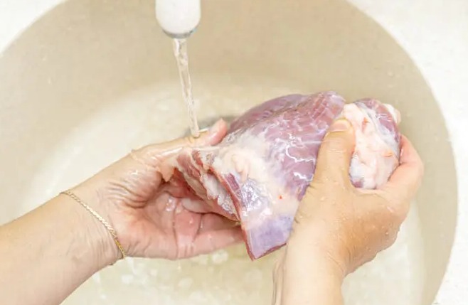 생고기는 물로 씻기보다는 핏물, 이물질 등을 키친타올로 닦아내는 게 좋다. 생고기 표면에 균이 있더라도 충분히 가열하면 살균된다. 어쩔 수 없이 씻어야 한다면 식재료 중 가장 마지막 순서에 세척하는 게 좋다. 채소류, 육류, 어류, 생닭 순으로 씻되 미리 세척한 재료와 조리기구는 안전한 곳으로 옮긴 상태여야 한다. 육류를 다룬 후에는 비누를 이용해 손을 씻는 것은 필수다.