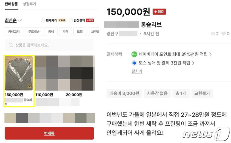 B씨는 지난달 중순께 중고거래 플랫폼 '번개장터'에 모 브랜드 제품 상의를 15만원에 내놨다. 제품 설명란에는 "이번 연도 가을에 일본에서 직접 27만~28만원 정도에 구매했다. 한 번 세탁 후 프린팅이 조금 까져서 안 입게돼 싸게 올린다"고 적었다.