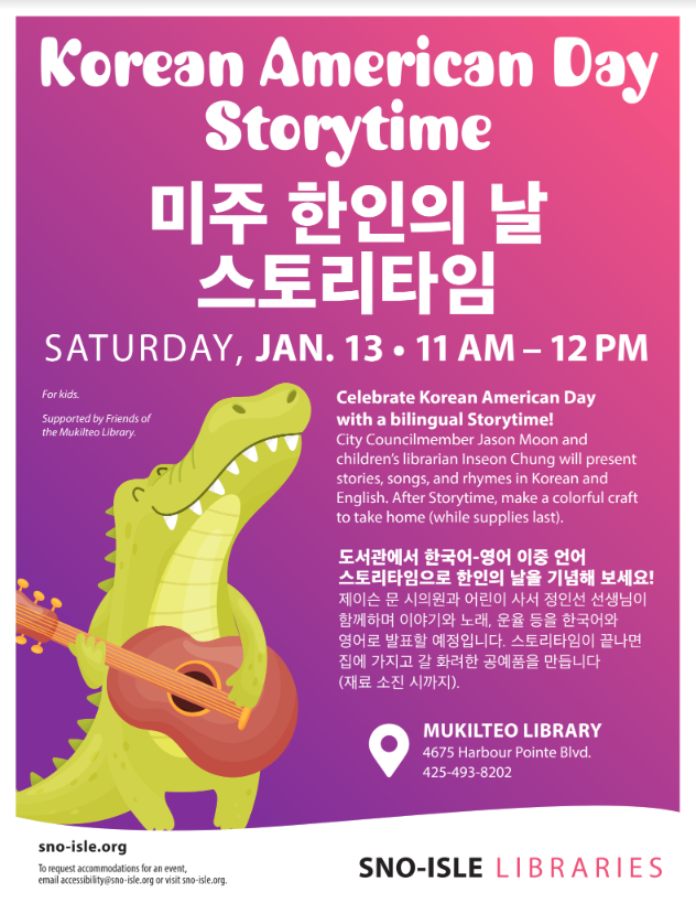 머킬티오 도서관, 13일 '한인의 날' 기념 스토리타임 시애틀조아 0 729 2024.01.08 04:39 [출처 ⓒ 조이시애틀뉴스]머킬티오 도서관1월 13일(토) 오전 11am-12pm