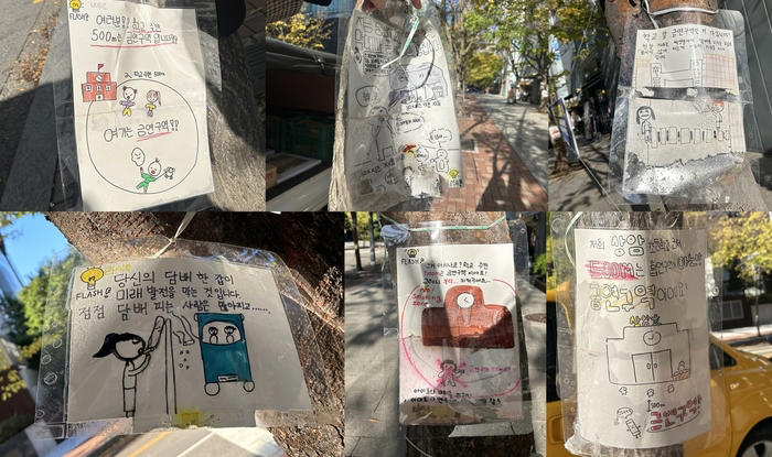 귀여운 글씨와 그림이지만 종이에 적힌 메시지는 명확했다. 아이들은 포스터에 ‘학생들이 등하교 때 담배 냄새로 고통받아요’ ‘한참 자라는 학생들에게 담배를 피우는 모습은 보이지 않도록 하는 게 어른의 의무 중 하나입니다’ ‘학교 주변 500m는 금연 구역입니다’ ‘저희가 흡연구역을 알려드릴 테니까 거기에서 피(우)세요’ ‘지금 당신이 피우는 작은 막대기가 세상을 망칩니다’라는 문구가 적혔다.