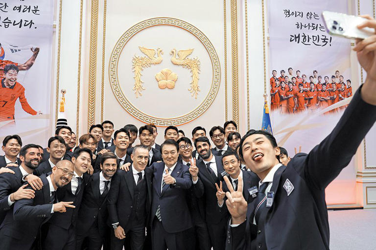 한편 윤 대통령은 이날 환영사에서 “여러분은 우리 국민에게는 이 월드컵 우승팀”이라며 “여러분의 젊음과 열정이 안팎으로 어려운 나라와 힘든 국민에게 큰 위로와 희망을 주셨고, 여러분의 투혼이 어떤 어려움도 이겨나갈 수 있다는 의지를 주셨다”고 격려했다.