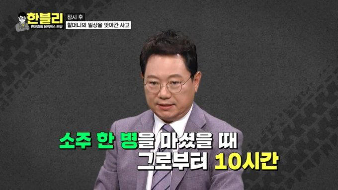 한문철은 “소주 한 병 마셨을 때 제일 안전한 건 그로부터 10시간이 지난 후”라며 “2병을 마셨으면 20시간 후, 3병을 마셨으면 30시간 후에 운전해야 안전하다”고 덧붙였다.