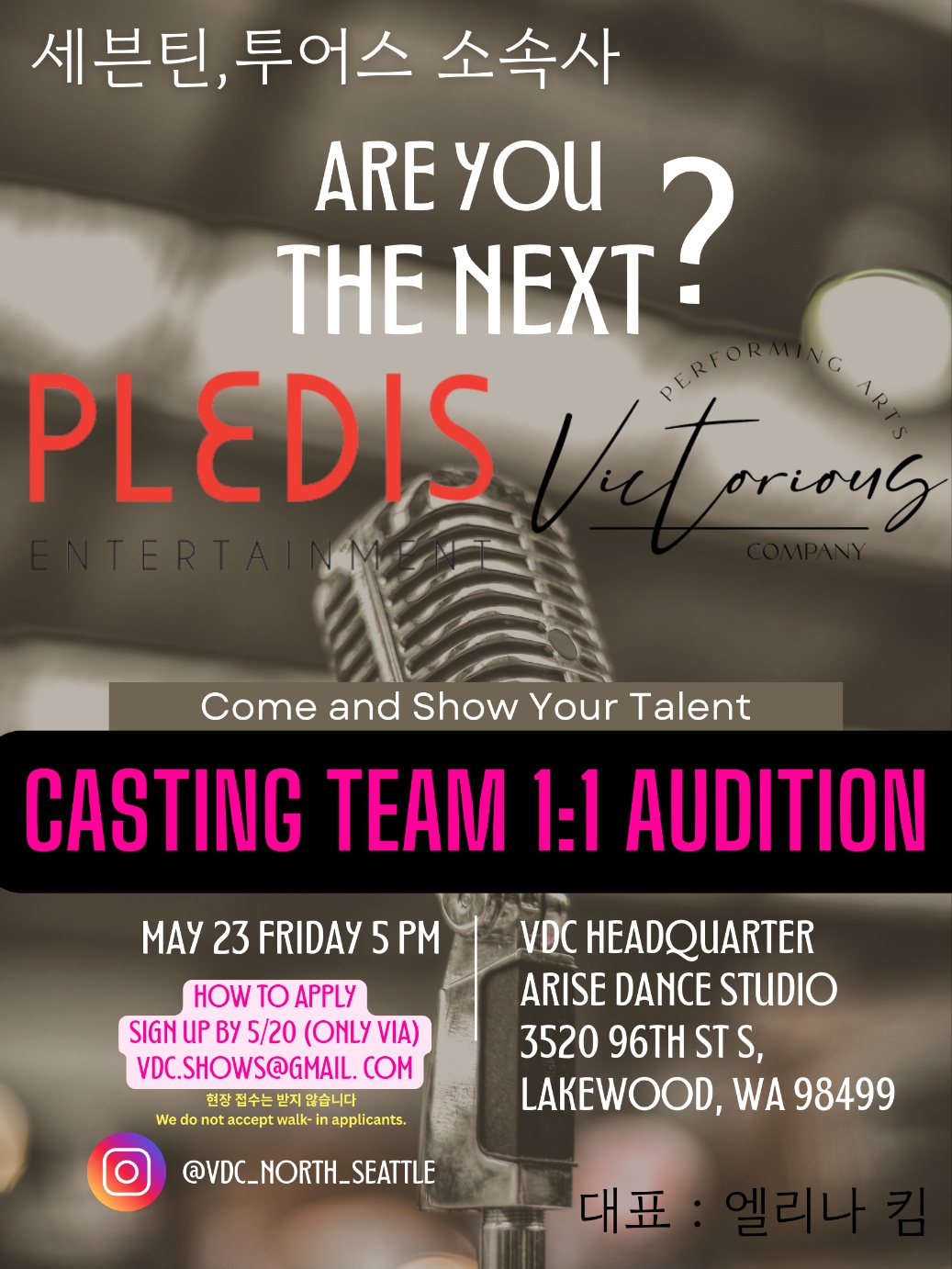 한국 유명 연예기획사인 플레디스 엔터테인먼트가 시애틀에서 오디션을 개최한다. 플레디스는 유명 그룹인 세븐틴과 투어스의 소속사이다.