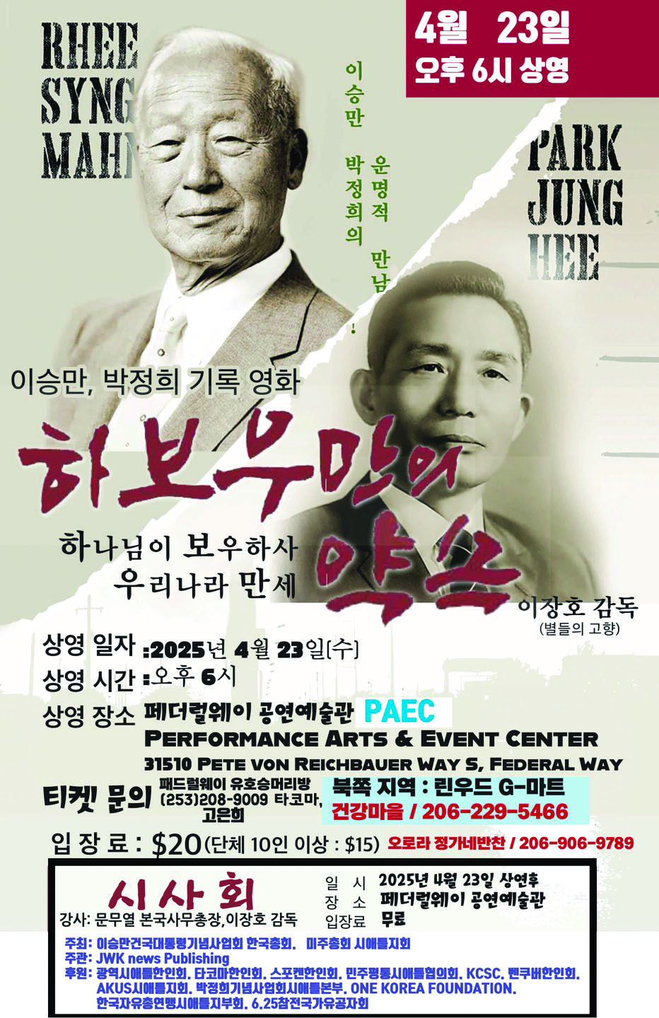<하보우만의 약속>은 오는 23일 오후 6시 페더럴웨이 공연예술센터(PAEC)에서 상영되며, 이승만건국대통령기념사업회 본부와 시애틀지회가 주최, JWK뉴스 퍼블리싱이 주관한다.
