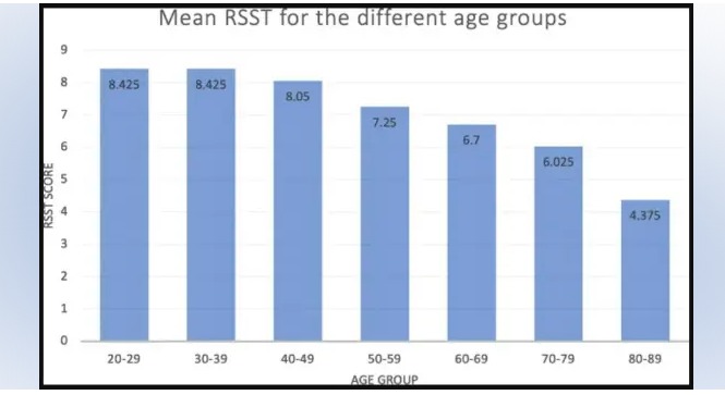 분석 결과, RSST 평균 점수는 연령대별로 차이가 났다. ▲20·30대는 약 8.5번 ▲40대는 약 8번 ▲50대는 약 7번 ▲60대는 약 6.5번 ▲70대는 약 6번 ▲80대는 약 4번 침을 삼켰다. 통상 남성이 여성보다 더 많이 삼켰고, 여러 약물을 복용하거나 BMI(체질량 지수)가 높은 사람은 삼키는 횟수가 낮았다.