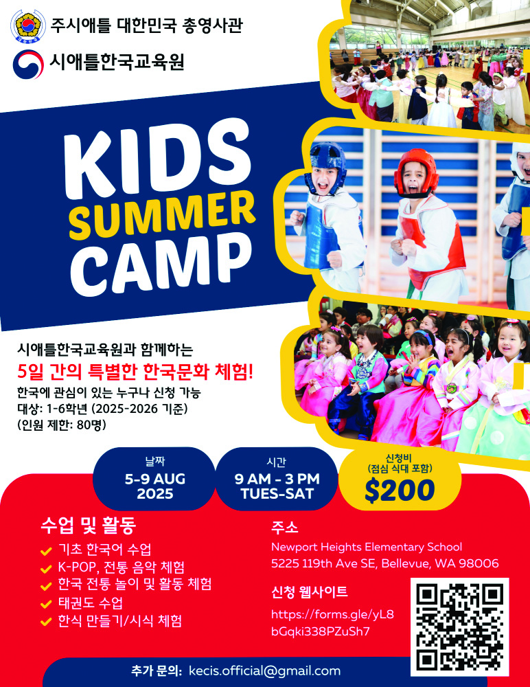 시애틀한국교육원이 전체를 주관하게 될 이번 캠프는 오는 8월 5일부터 9일까지 5일 동안 매일 오전 9시부터 오후 3시까지 벨뷰 뉴포트 하이츠 초등학교에서 실시된다.