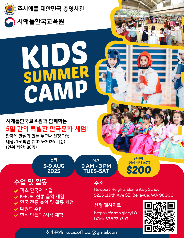 시애틀한국교육원이 전체를 주관하게 될 이번 캠프는 오는 8월 5일부터 9일까지 5일 동안 매일 오전 9시부터 오후 3시까지 벨뷰 뉴포트 하이츠 초등학교에서 실시된다.