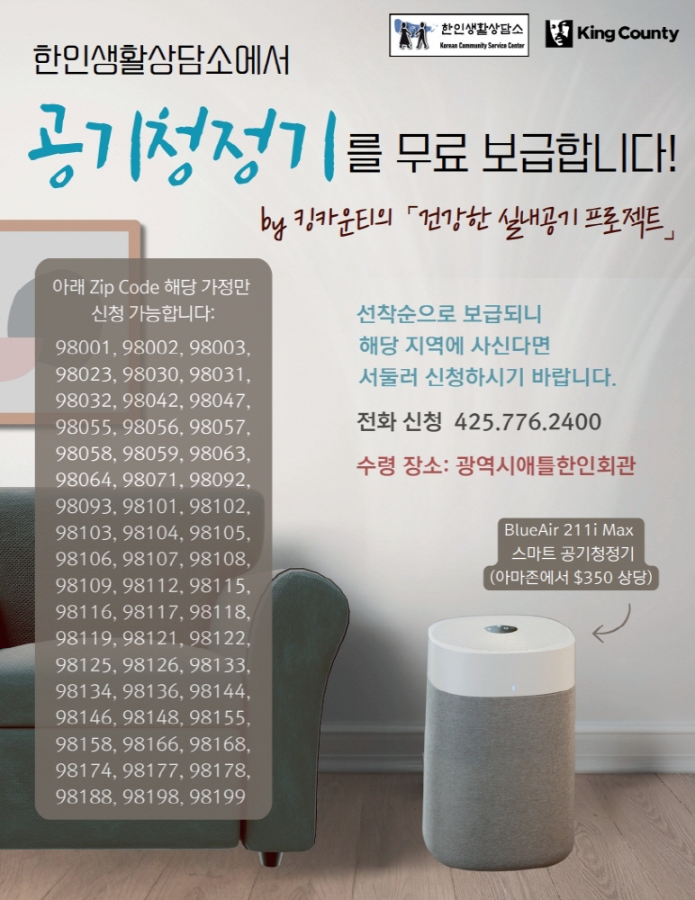 한인생활상담소(소장 김주미)가 킹카운티와 협력해 시애틀지역 한인 가구에 350달러 상당의 공기청정기를 무료로 제공한다.