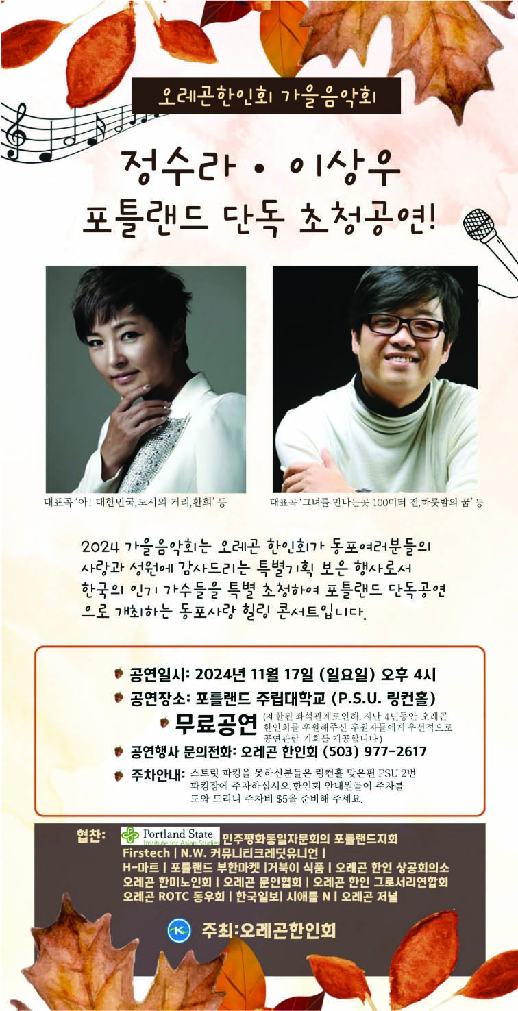 오레곤한인회 ‘가을 음악회’ 무료로 ...유명 가수 정수라, 이상우 초청