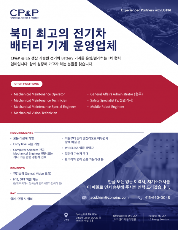CP&P 는 LG 1차 협력 업체입니다. [CP&P] 전기차 배터리 채용 공고 CP&P 는 LG 전자 생산 기술원 전기차 Battery 기계를 운영/관리하는 1차 협력 업체입니다. 함께 성장해 가고자 하는 분들을 찾습니다. 1.근무지: Spring Hill, TN, USA Ultium Cell 은 LG/GM 의 joint 회사 입니다 Holland MI USA - LG Energy Solution Jeffersonville OH USA - LG 혼다 합작법인 2. 채용분야 Maintenance Engineering Operator Project Mechanical Maintenance Engineer. Project Mechanical Vision Engineer Mobile Robot Engineer General Affairs Administrator (총무) Safety Specialis (안전관리자) 3.급여:면접시 협의 4.지원자격 모든 이공계 계열 / Entry level 지원 가능 / Computer Sciences 전공 Mechanical Engineer 전공 또는 기타 모든 관련 경험자 선호 처음부터 같이 열정적으로 배우면서 함께 하실 분 WIRELESS 업종 경력자 / 일본어 가능자 우대 /한국어와 영어 소통 가능하신 분 5. Benefits - 건강보험(Dental, Vision 포함) - H1B, OPT 지원 가능 (현재 미국에서 일하는데 결격사유가 없어야 함) 6.지원 방법 - 한글 또는 영문 이력서, 자기소개서를 아래 이메일로 보내주시기 바랍니다. - Jacobkim@cpnpinc.com - 615-660-0048 Thank you Jacob Kim
