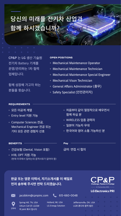 CP&P 는 LG 1차 협력 업체입니다. [CP&P] 전기차 배터리 채용 공고 CP&P 는 LG 전자 생산 기술원 전기차 Battery 기계를 운영/관리하는 1차 협력 업체입니다. 함께 성장해 가고자 하는 분들을 찾습니다. 1.근무지: Spring Hill, TN, USA Ultium Cell 은 LG/GM 의 joint 회사 입니다 Holland MI USA - LG Energy Solution Jeffersonville OH USA - LG 혼다 합작법인 2. 채용분야 Maintenance Engineering Operator Maintenance Engineering Technician Machine vision Systems Technician Mobile Robot Techintion General Affairs Administrator (총무) Safety Specialis (안전관리자) 3.급여:면접시 협의 4.지원자격 모든 이공계 계열 / Entry level 지원 가능 / Computer Sciences 전공 Mechanical Engineer 전공 또는 기타 모든 관련 경험자 선호 처음부터 같이 열정적으로 배우면서 함께 하실 분 WIRELESS 업종 경력자 / 일본어 가능자 우대 /한국어와 영어 소통 가능하신 분 5. Benefits - 건강보험(Dental, Vision 포함) - H1B, OPT 지원 가능 (현재 미국에서 일하는데 결격사유가 없어야 함) 6.지원 방법 - 한글 또는 영문 이력서, 자기소개서를 아래 이메일로 보내주시기 바랍니다. - Jacobkim@cpnpinc.com - 615-660-0048 Thank you Jacob Kim |
