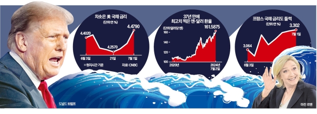 ‘슈퍼 선거의 해’를 맞아 정치가 세계 경제를 덮치고 있다. 도널드 트럼프 전 미국 대통령이 재선하면 인플레이션이 다시 고개를 들 것이란 전망에 미 국채 금리가 급등하고 달러화도 강세를 나타냈다. 유럽에서는 이달 프랑스 영국 등의 조기 총선에서 강경 우파 정당이 득세하며 금융시장 불안이 찾아오는 ‘7월의 공포’가 우려되고 있다.