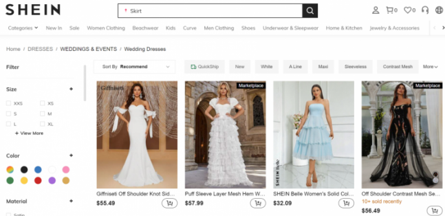 세계 최대 온라인 패스트패션 업체 쉬인도 평균 50~100달러, 최대 200달러의 웨딩드레스를 선보이며 시장에 참전했다. 쉬인은 이달 말 라스베이거스에 웨딩 관련 팝업스토어를 열고 본격적인 신부 및 들러리 드레스 제품 라인을 공개할 예정이다.