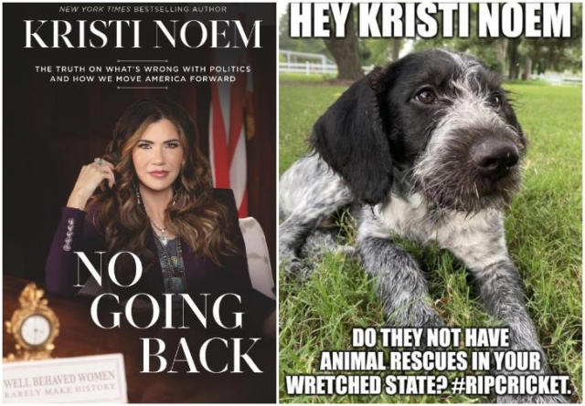 노엄 주지사는 책에서 14개월 된 강아지 ‘크리켓’이 잘 훈련된 사냥개로 자라기를 바랐지만, 지나친 공격성을 보인 탓에 자갈밭에서 총으로 쏴죽였다고 털어놨다. 흥분한 크리켓이 새를 쫓으면서 사냥을 망칠 뿐아니라 지역 민가의 닭들을 물어뜯으면서 피해를 준 데다 보호자인 노엄 주지사 본인까지 물려고 했다는 것이다.