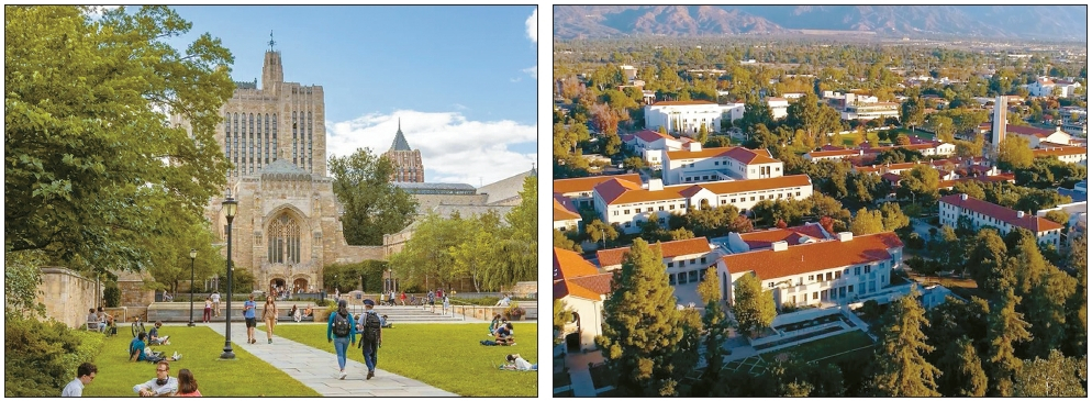 전국의 23개 대학교가 재학생들이 학자금 부채를 지지 않도록 ‘무대출’ 정책을 채택하고 있다. 사진은 중 예일 대학교(왼쪽)와 포모나 칼리지 전경.